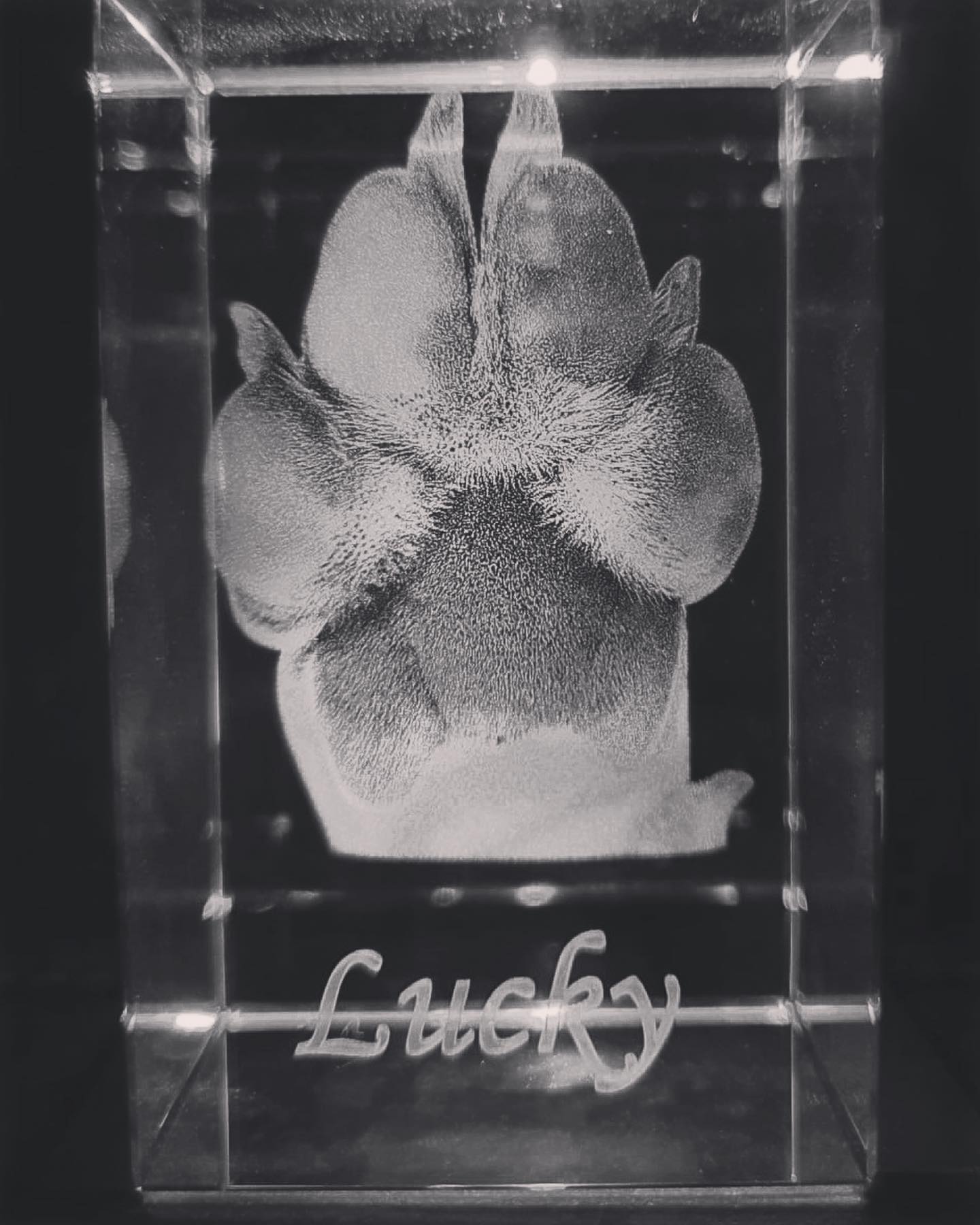 Die Asche kann in Glasskulpturen eingearbeitet werden. Es ist auch möglich, einen Erinnerungskristall mit dem Foto Ihres Tieres anfertigen zu lassen.